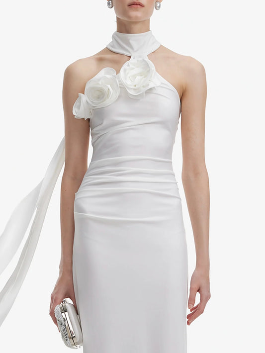 Çiçek Detaylarıyla Boyundan Bağlamalı Yaka Elbise