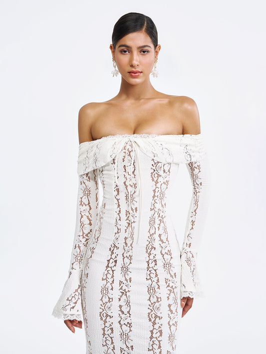 Çiçek Dantel Uzun Kollu Omuzdan Bağlamalı Maksi Elbise
