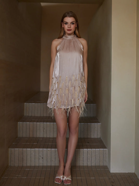 26% İndirimTüy İşlemeli Halter Yaka Elbise