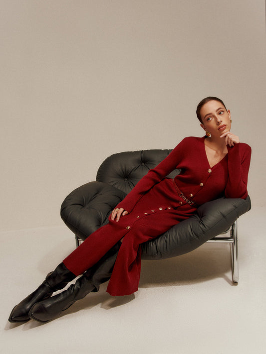 28% İndirimTyra V Yaka Düğmeli Kemer Örgü Elbise Uzun