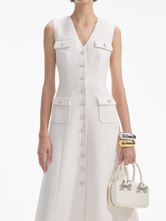 24% İndirimİnci Düğmeli Kolsuz V Yaka Midi Elbise