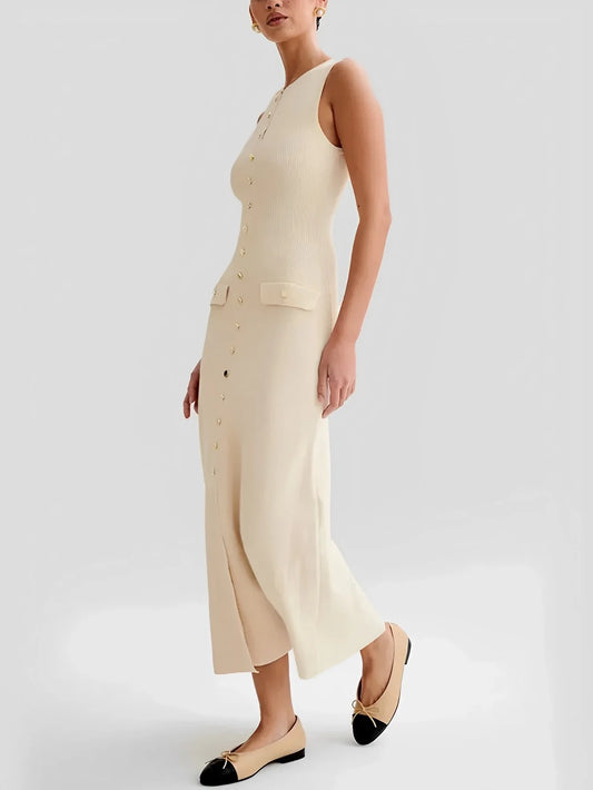 26% İndirimKrem Rengi Kolsuz Düğmeli Örgü Uzun Elbise