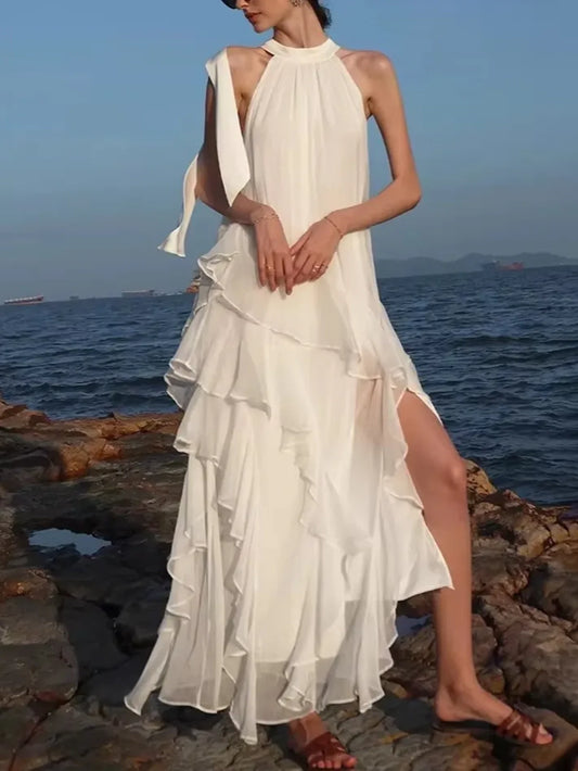 19% İndirimWesley Beyaz Kolsuz Fırfırlı Uzun Elbise