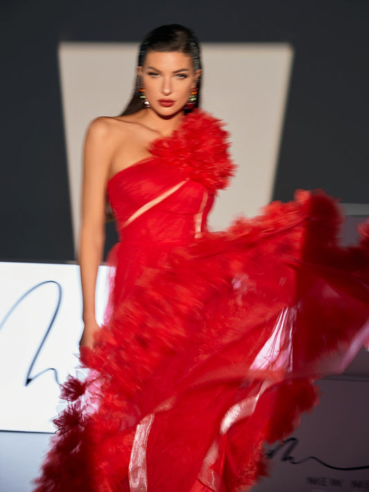 30% İndirimGhslaine Tek Omuzlu Tül Midi Elbise