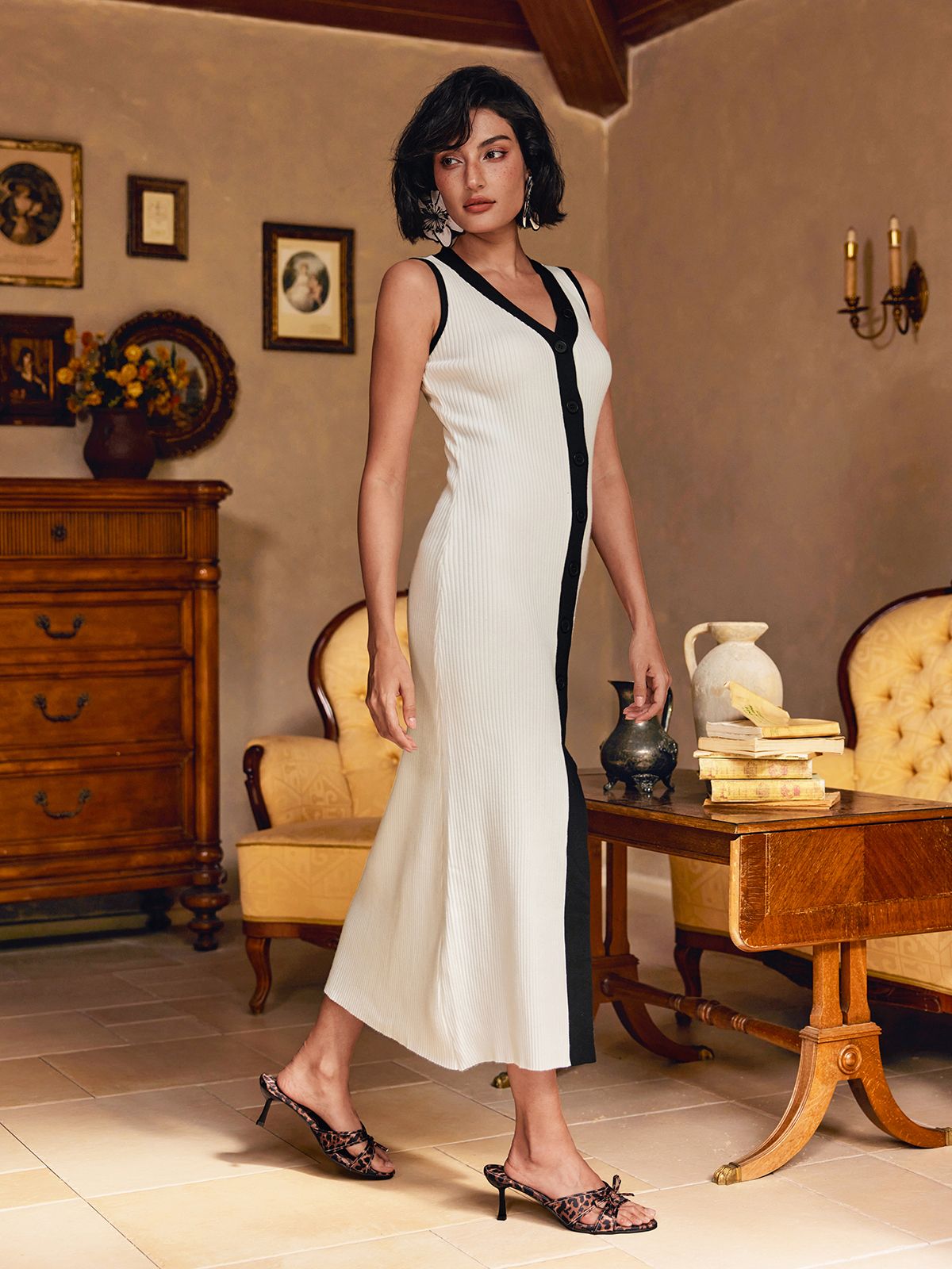 Allston V Yaka Düğmeli Örme Midi Elbise Beyaz