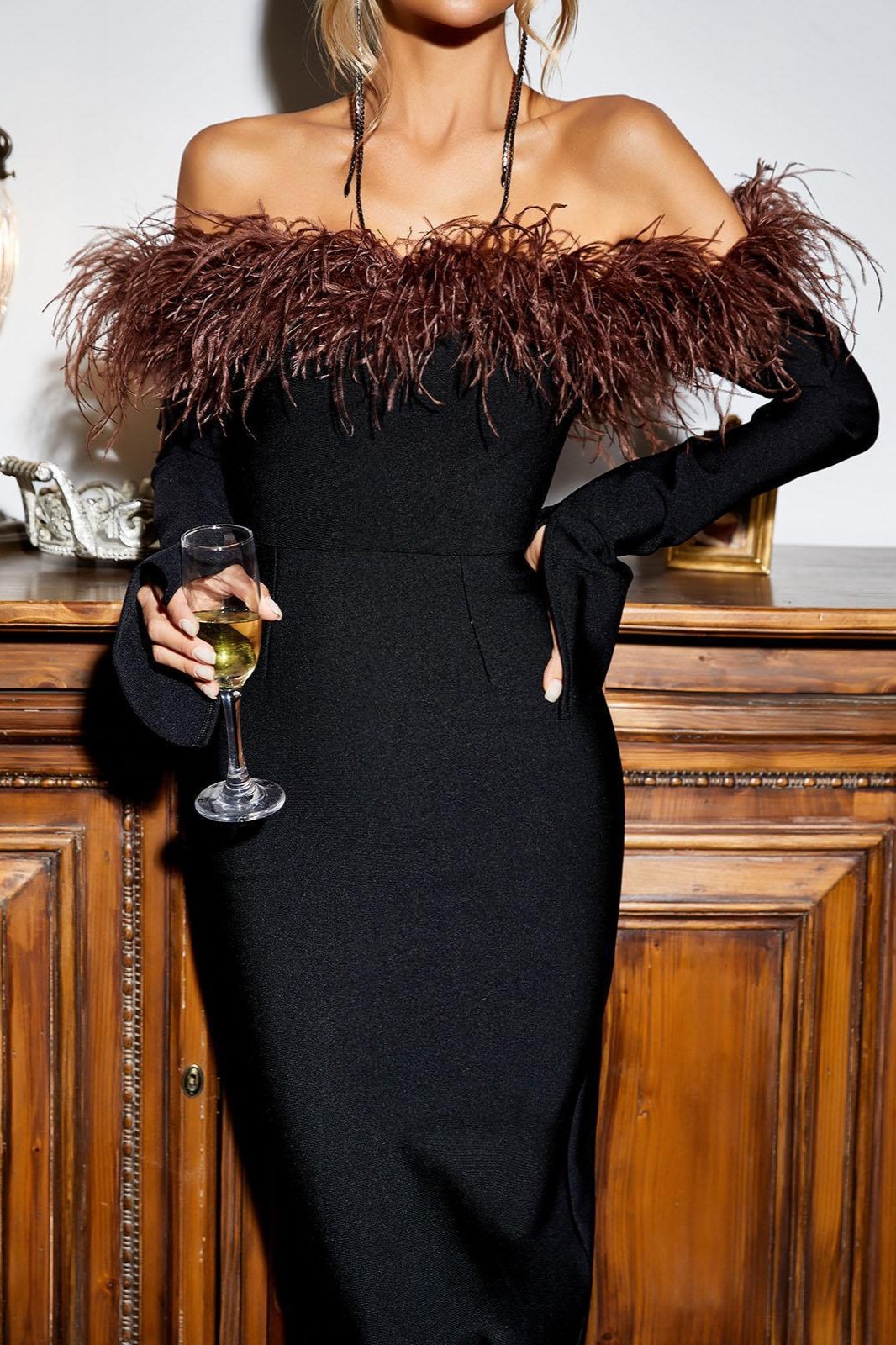 Blanche Omuzdan Bağlamalı Tüylü Midi Siyah Elbise