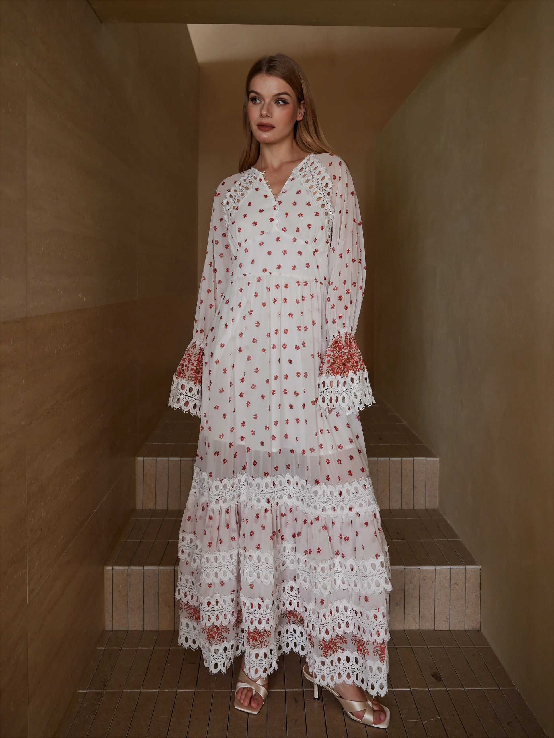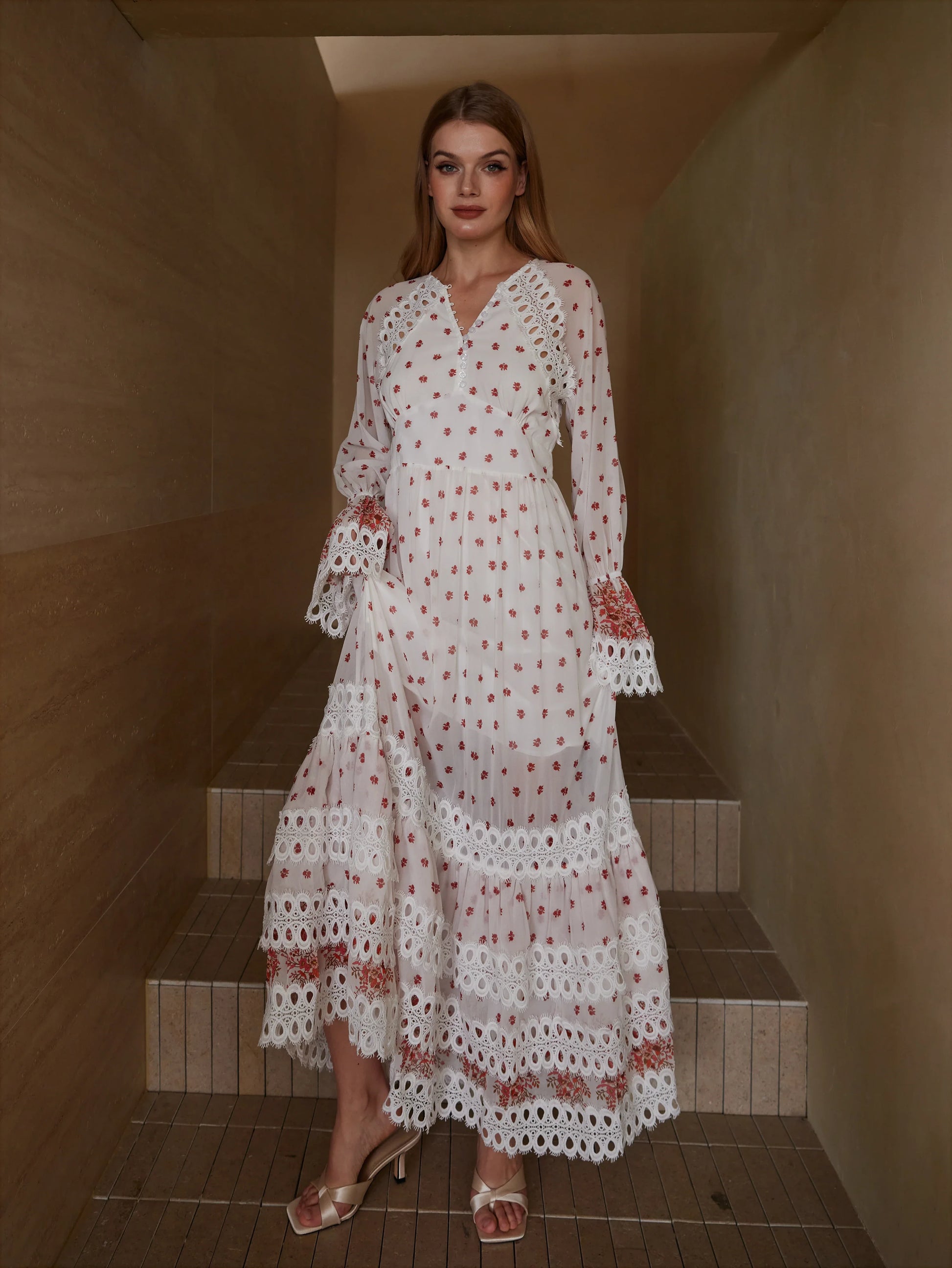 Bohem Çiçek İşlemeli Puantiyeli Uzun Elbise
