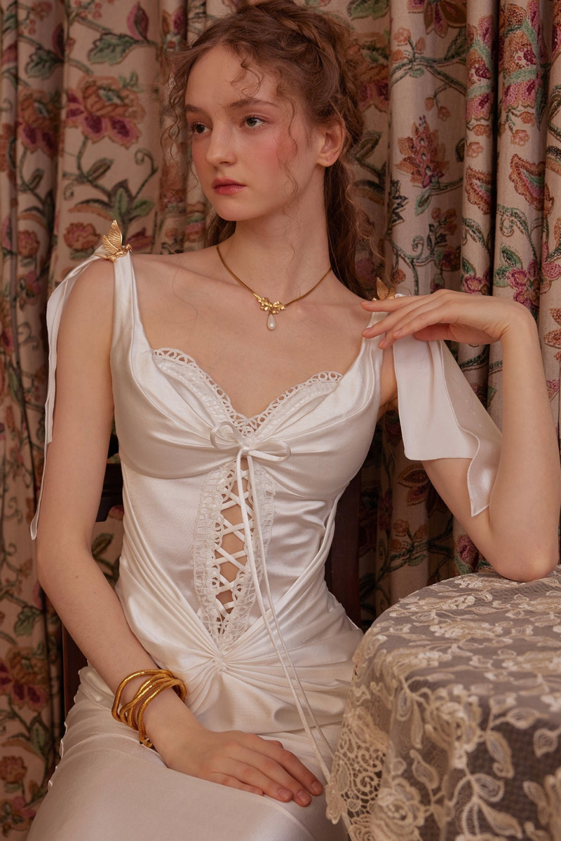 Delphina Saten Kıvrımlı Bağcıklı Midi Elbise