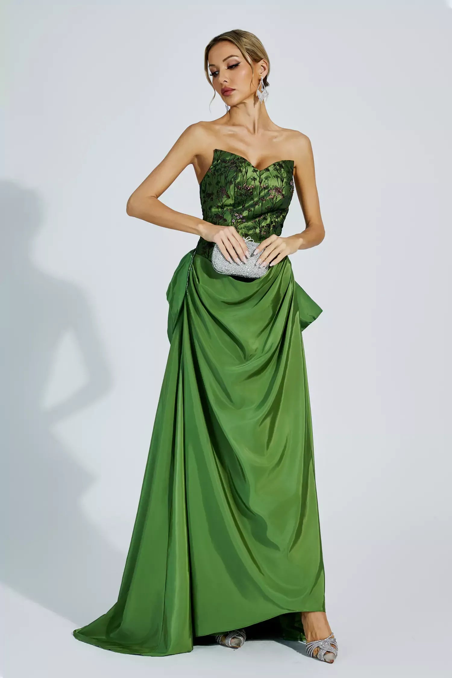 Dulce Yeşil Kıvrımlı Omuzları Açık Uzun Elbise