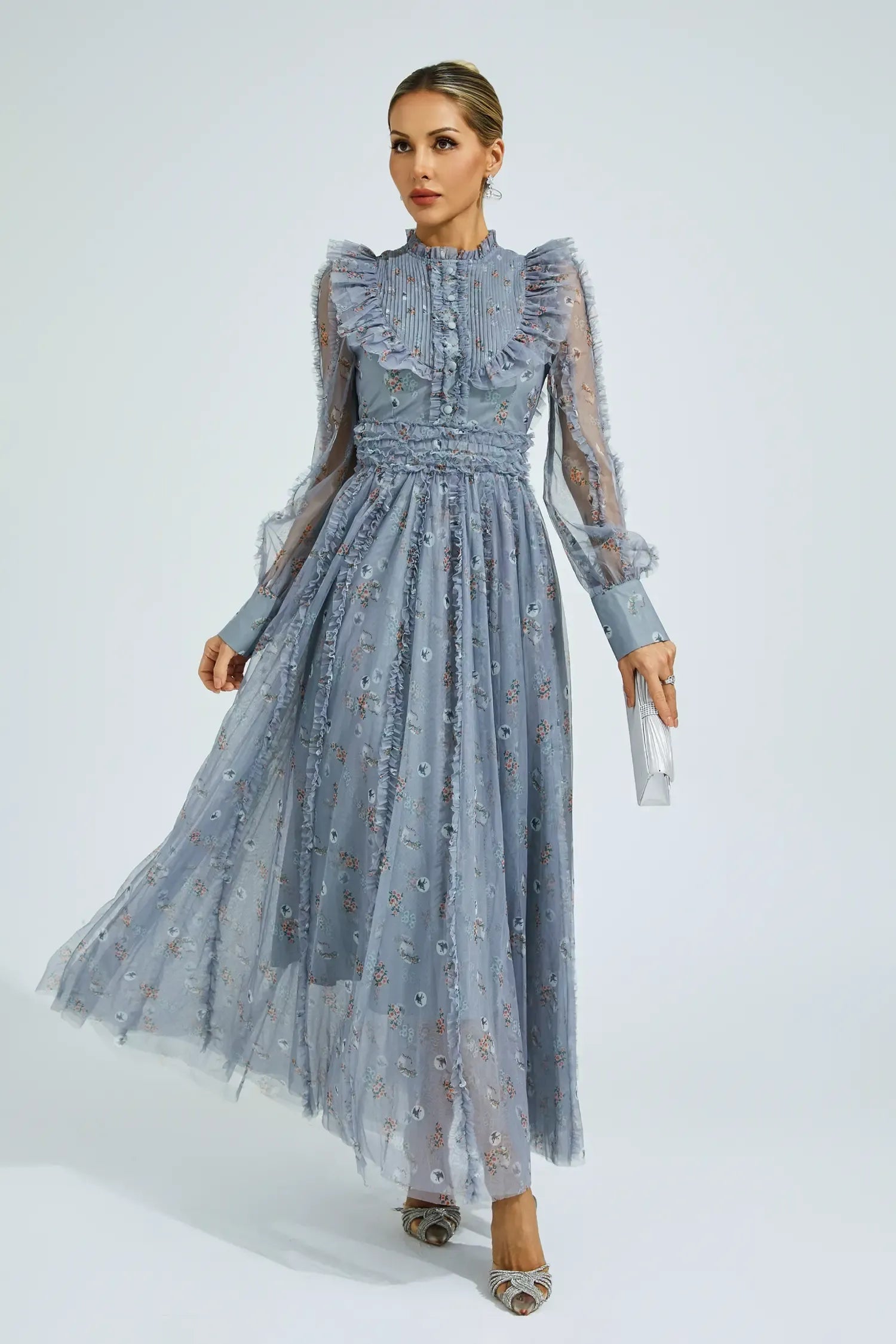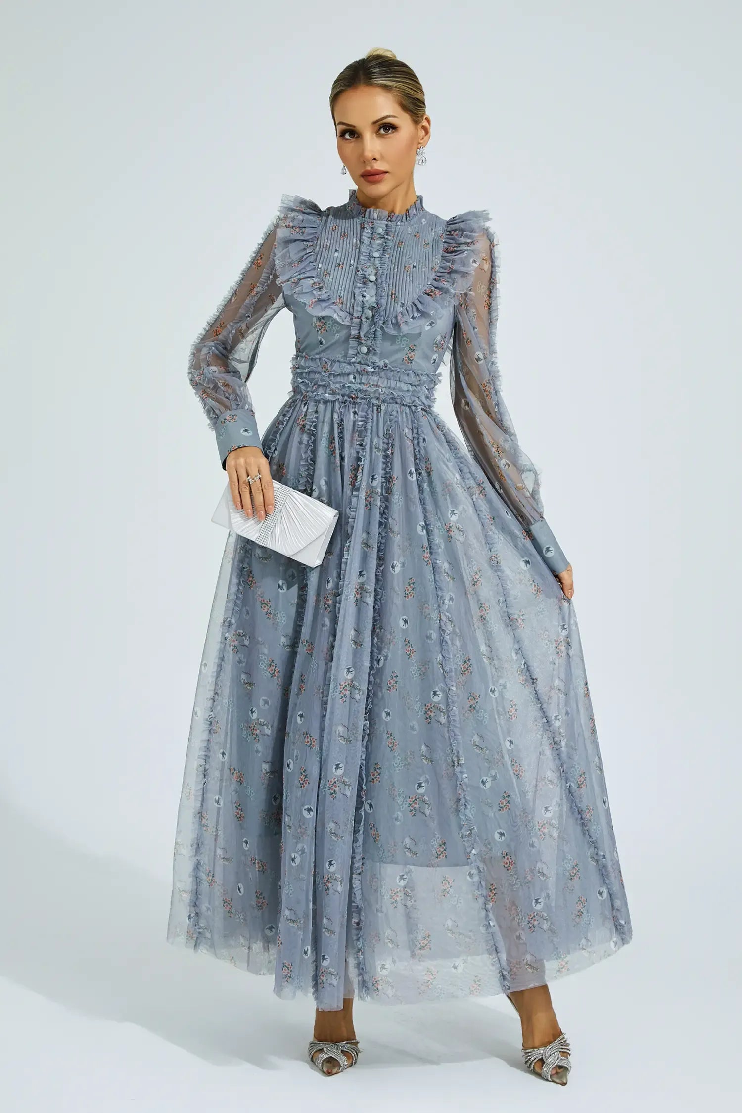 Elara Mavi Çiçek Uzun Kollu Uzun Elbise