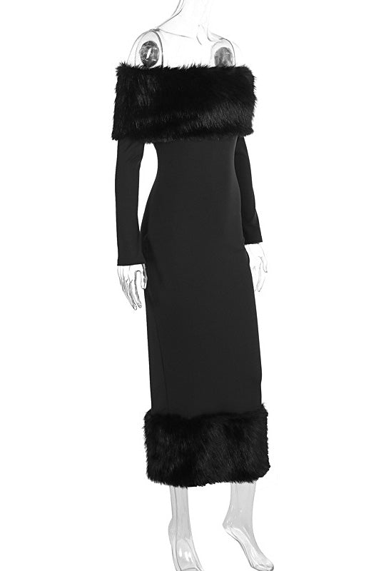 Şık Tek Omuzlu Kürk Yaka Dar Midi Elbiseler