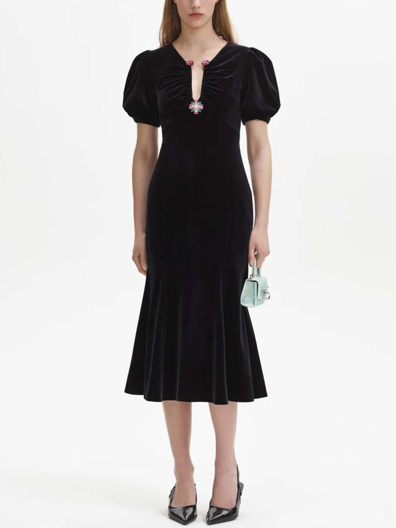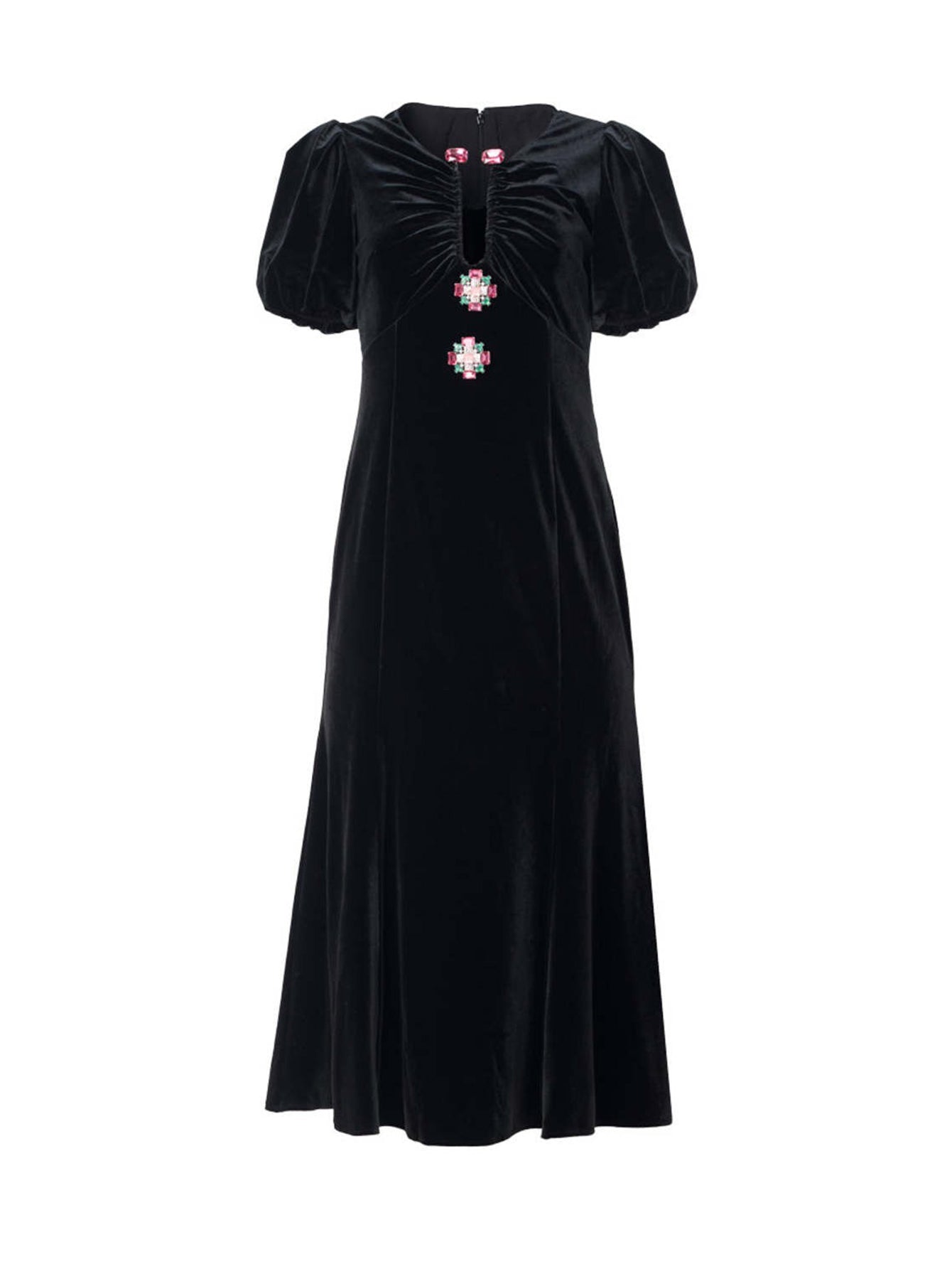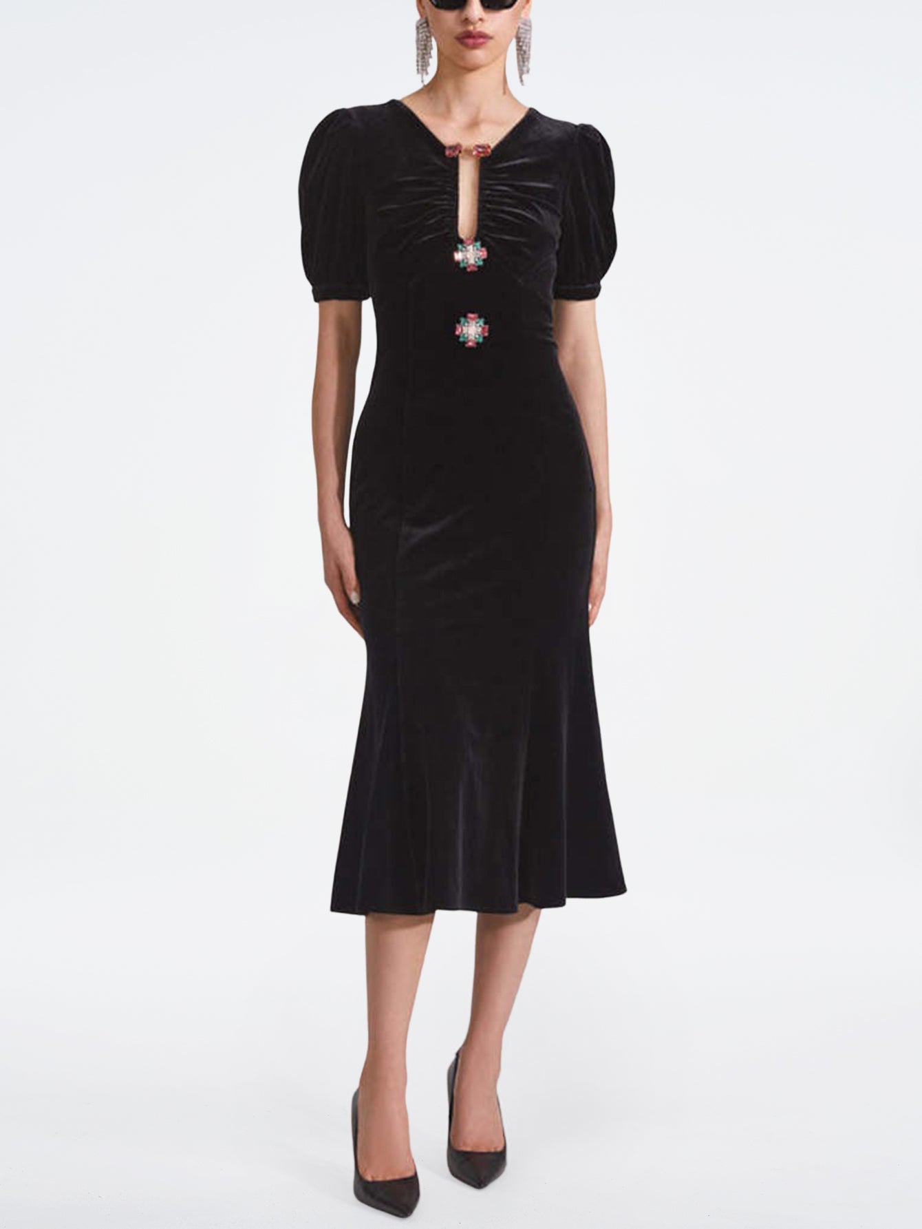 Püsküllü Kollu İşlemeli Kadife Midi Elbise