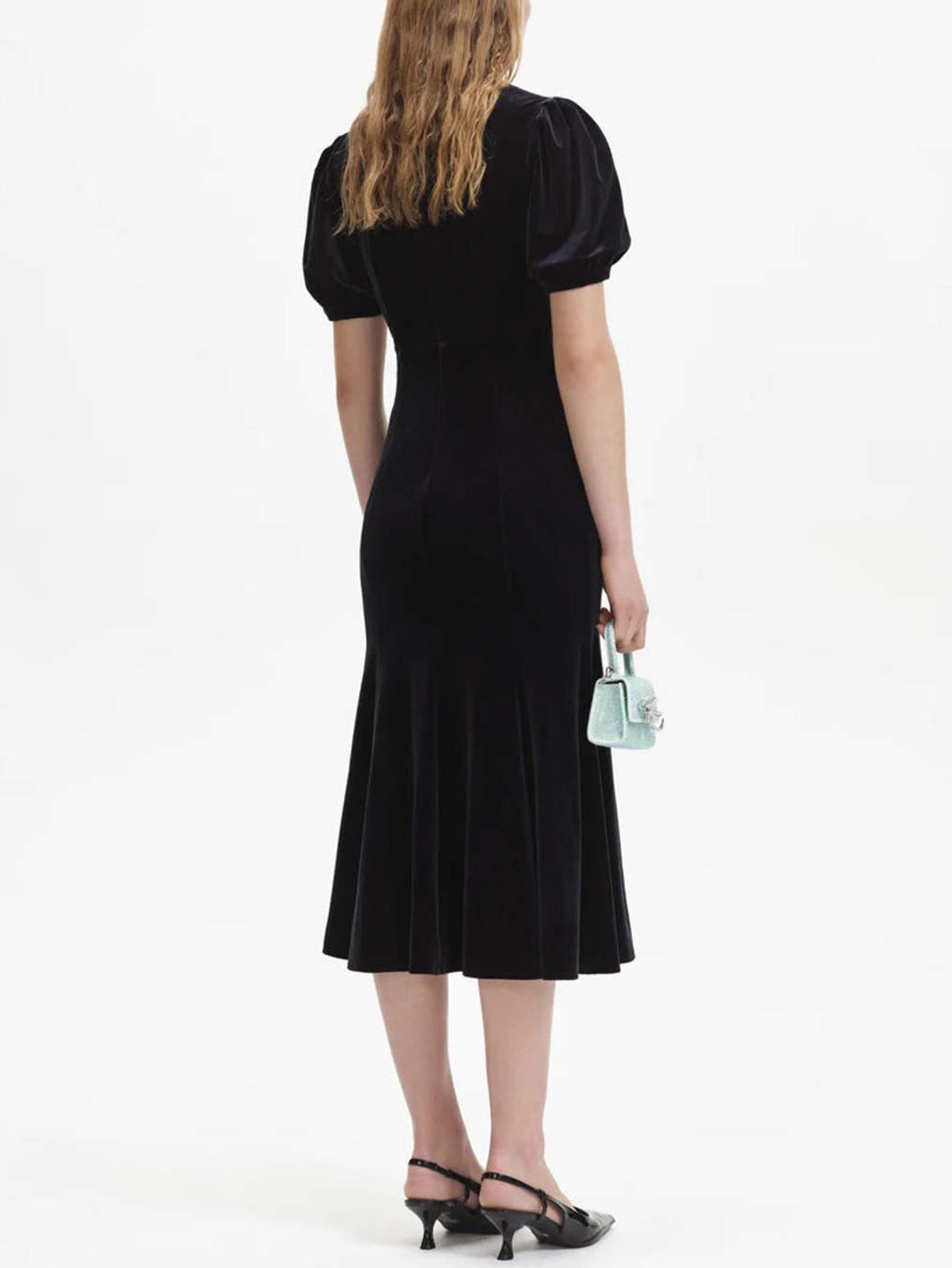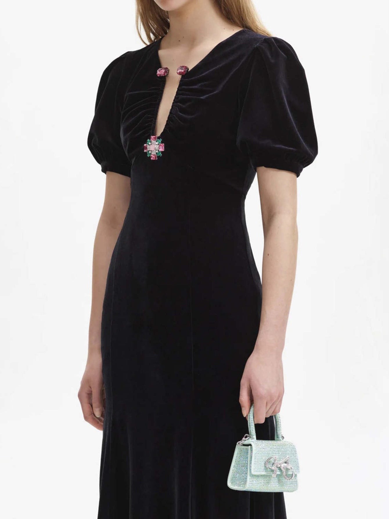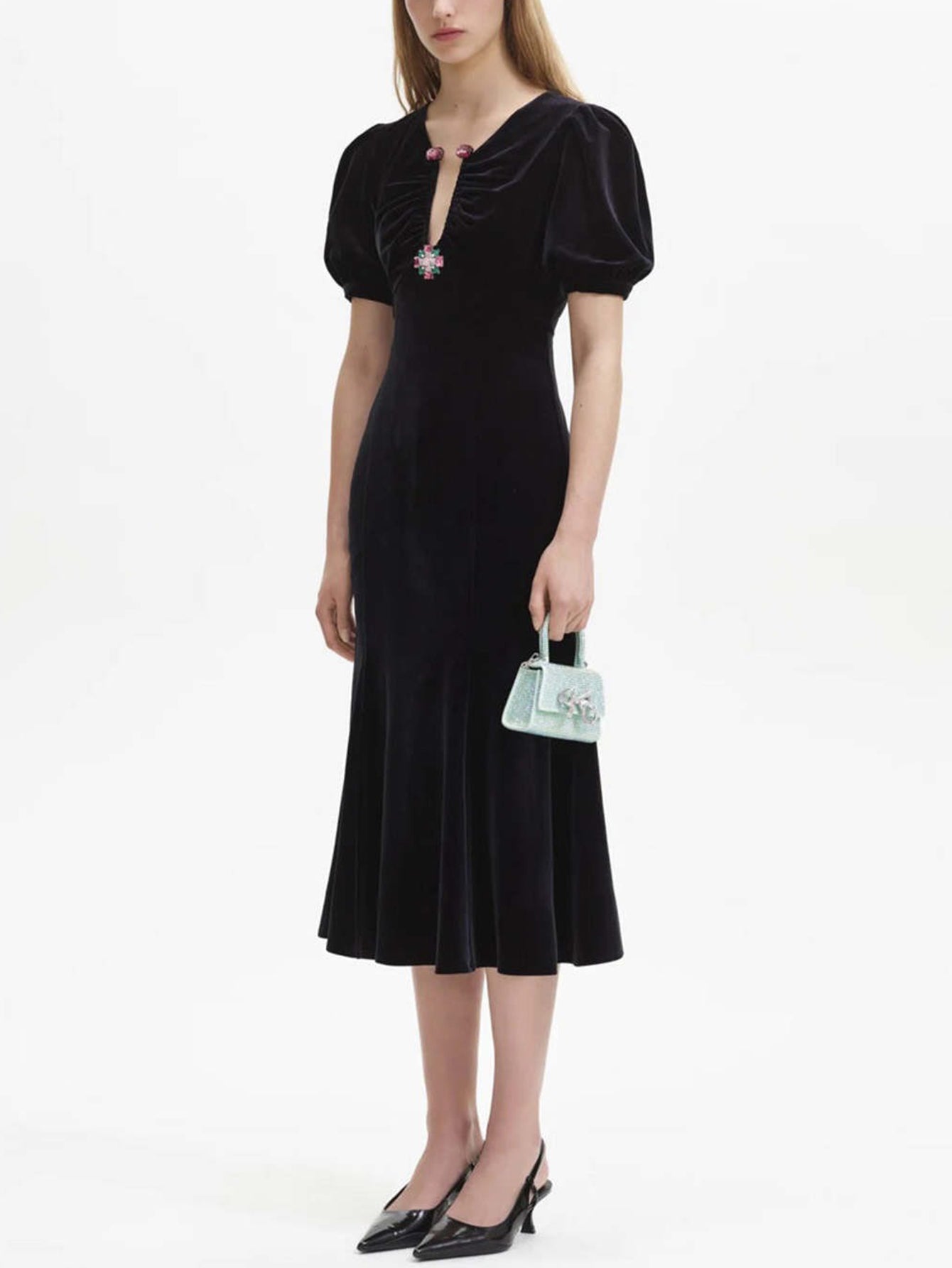 Püsküllü Kollu İşlemeli Kadife Midi Elbise