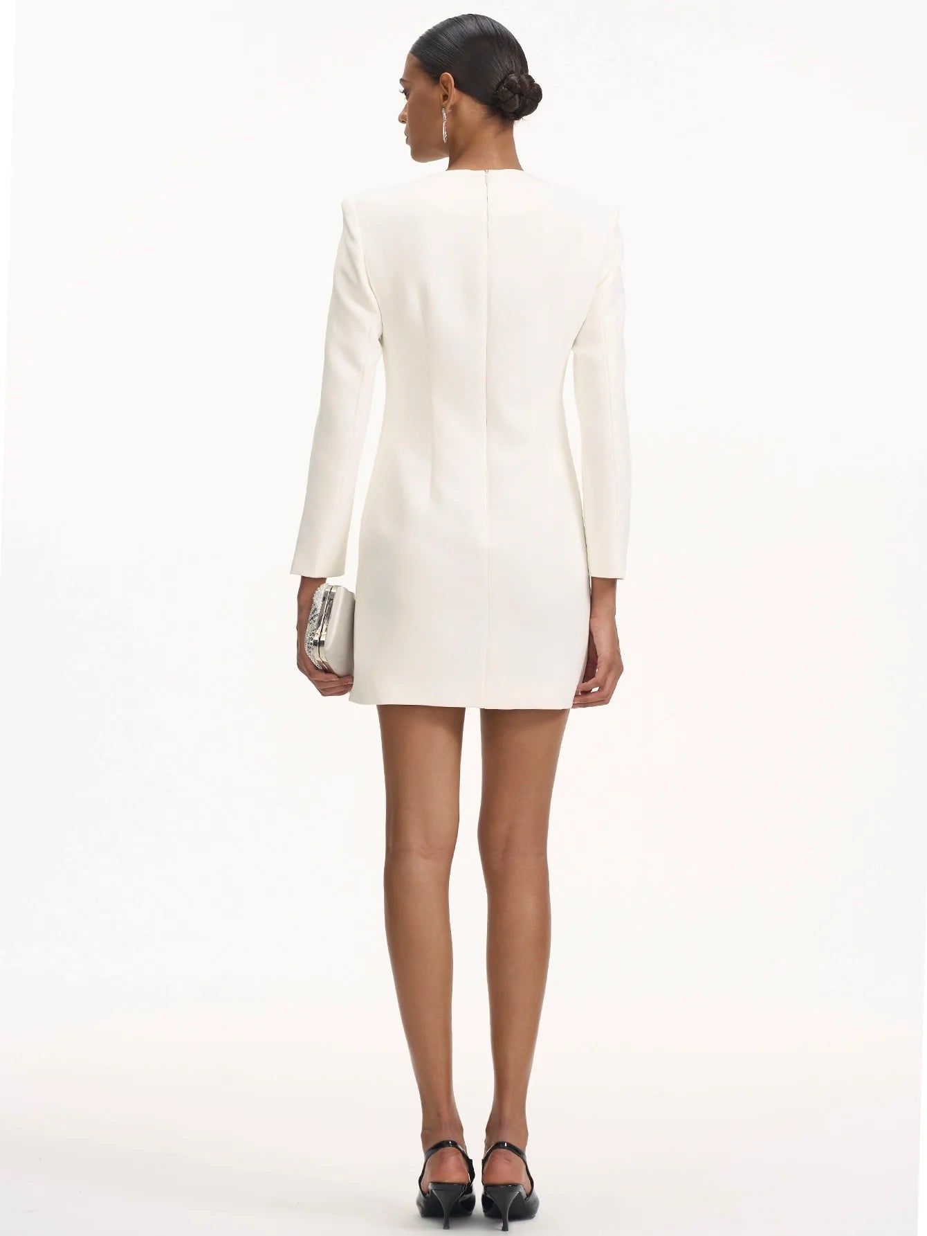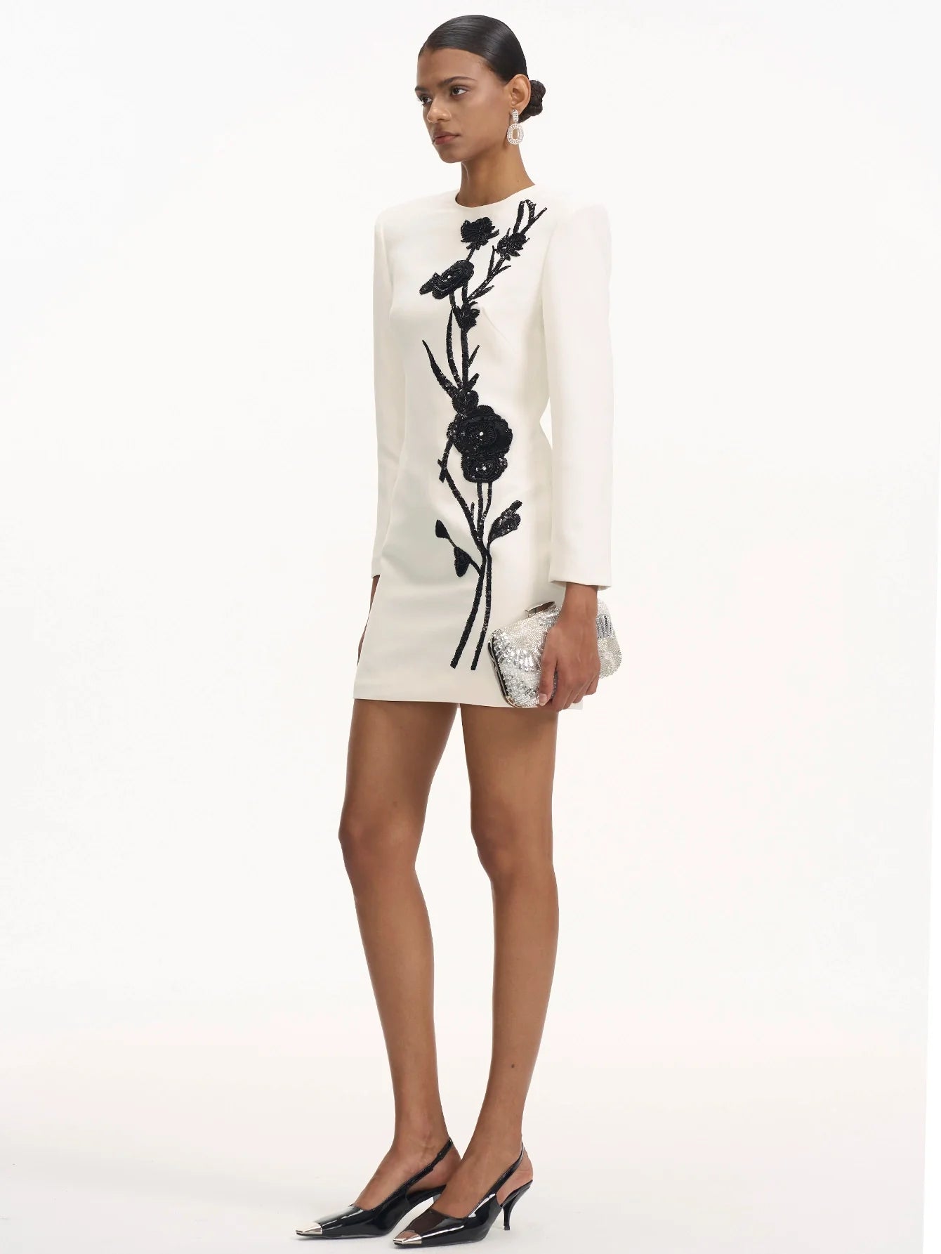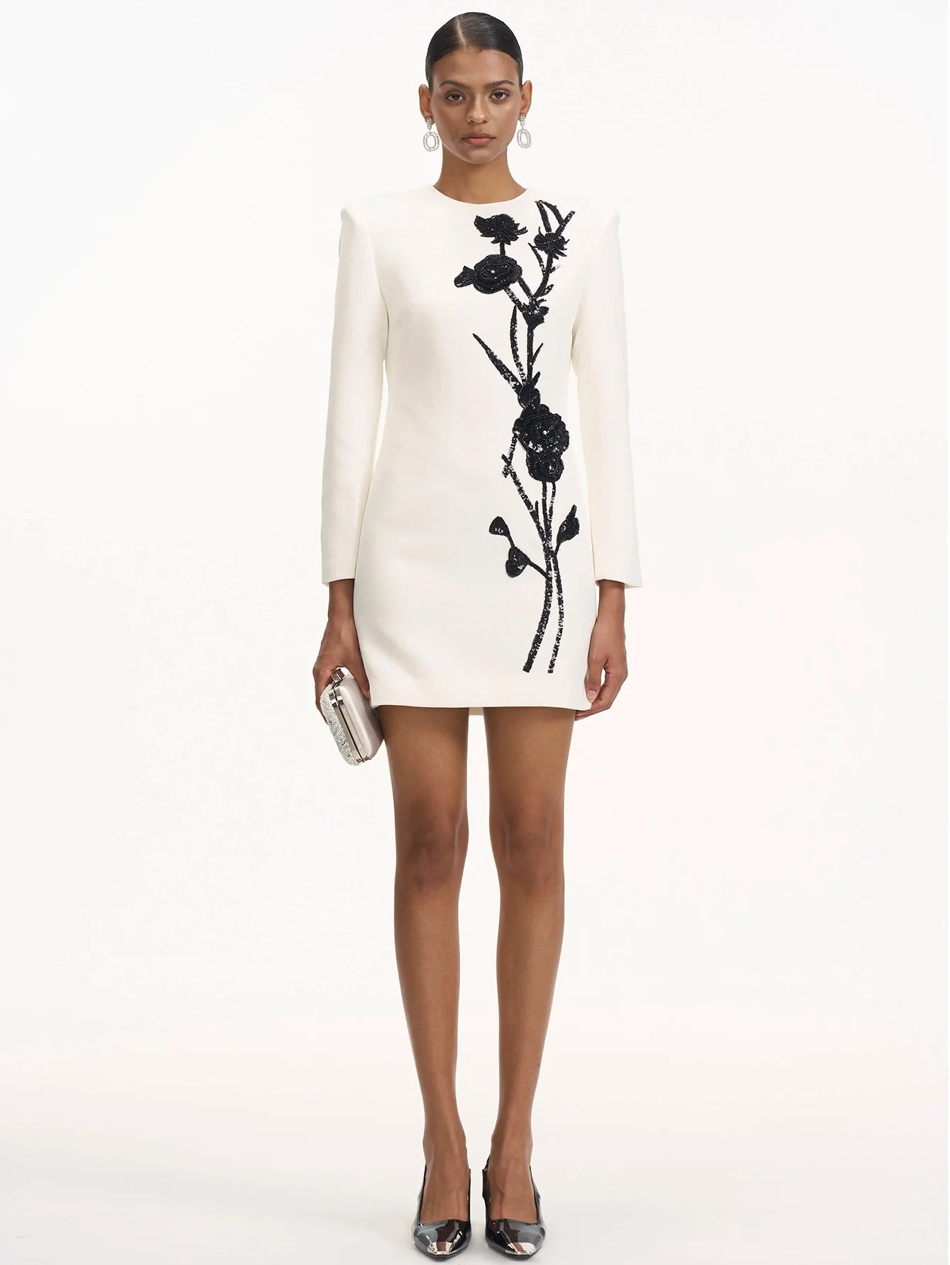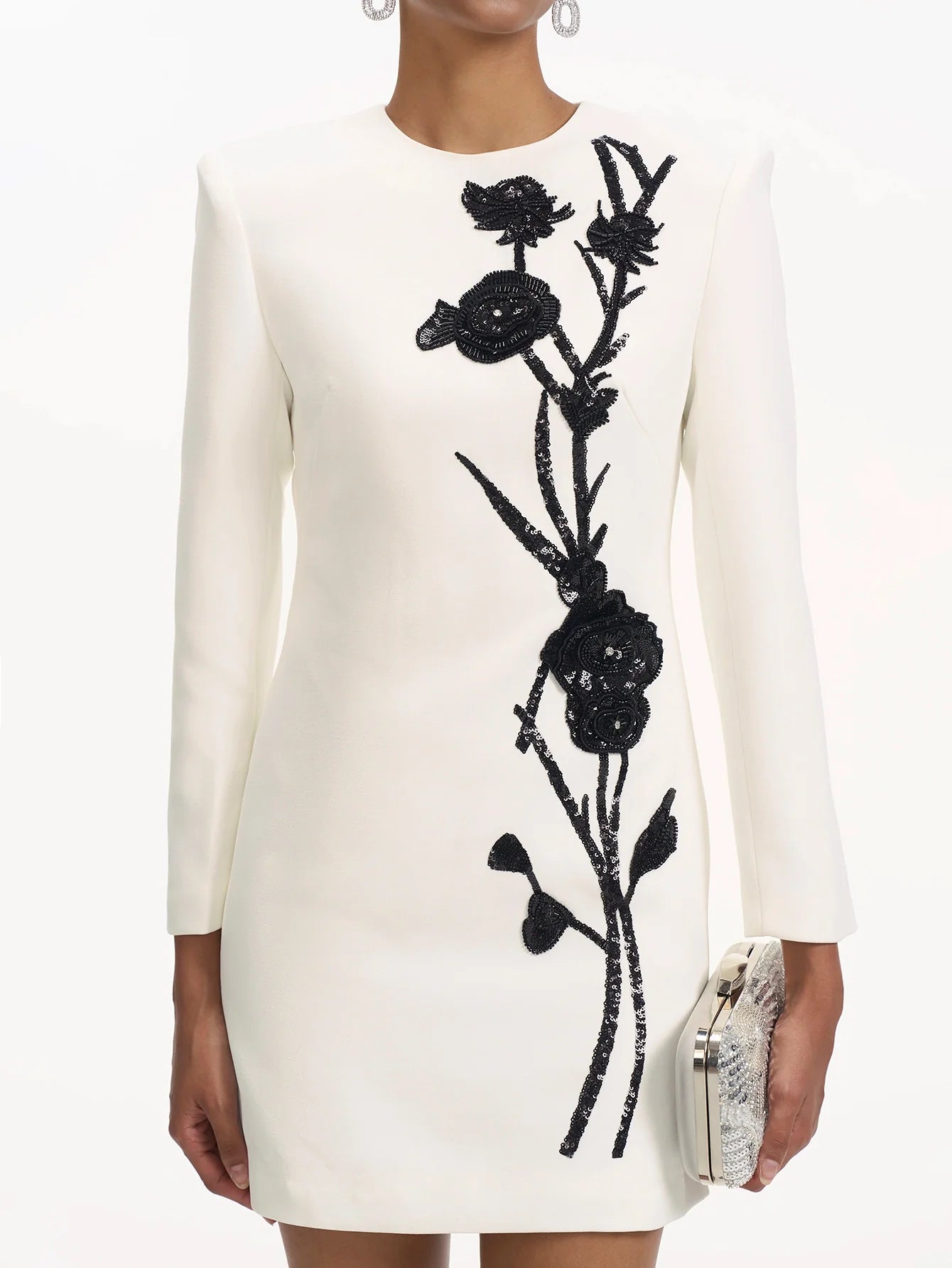 Uzun Kollu Çiçekli İşlemeli Beyaz Mini Elbise