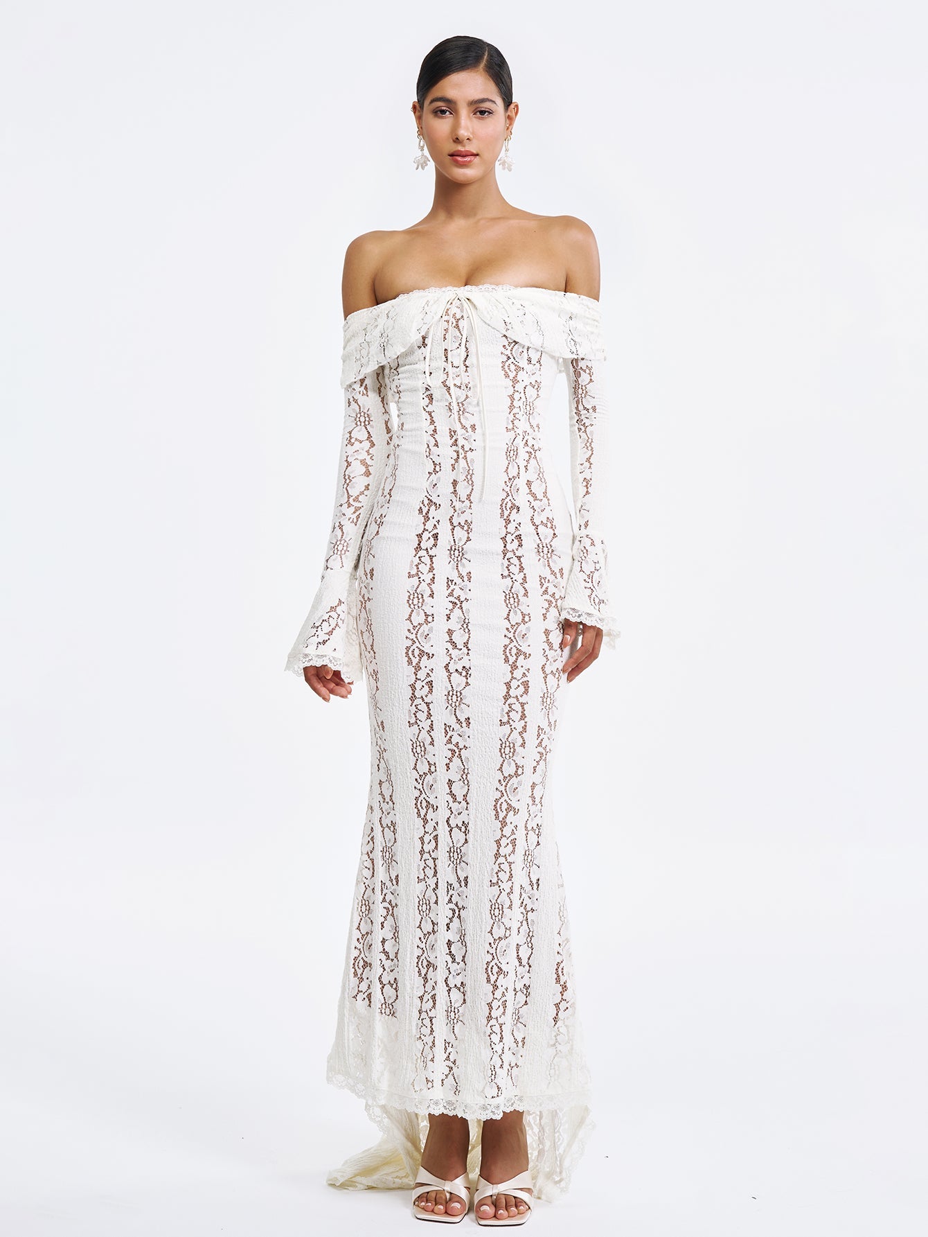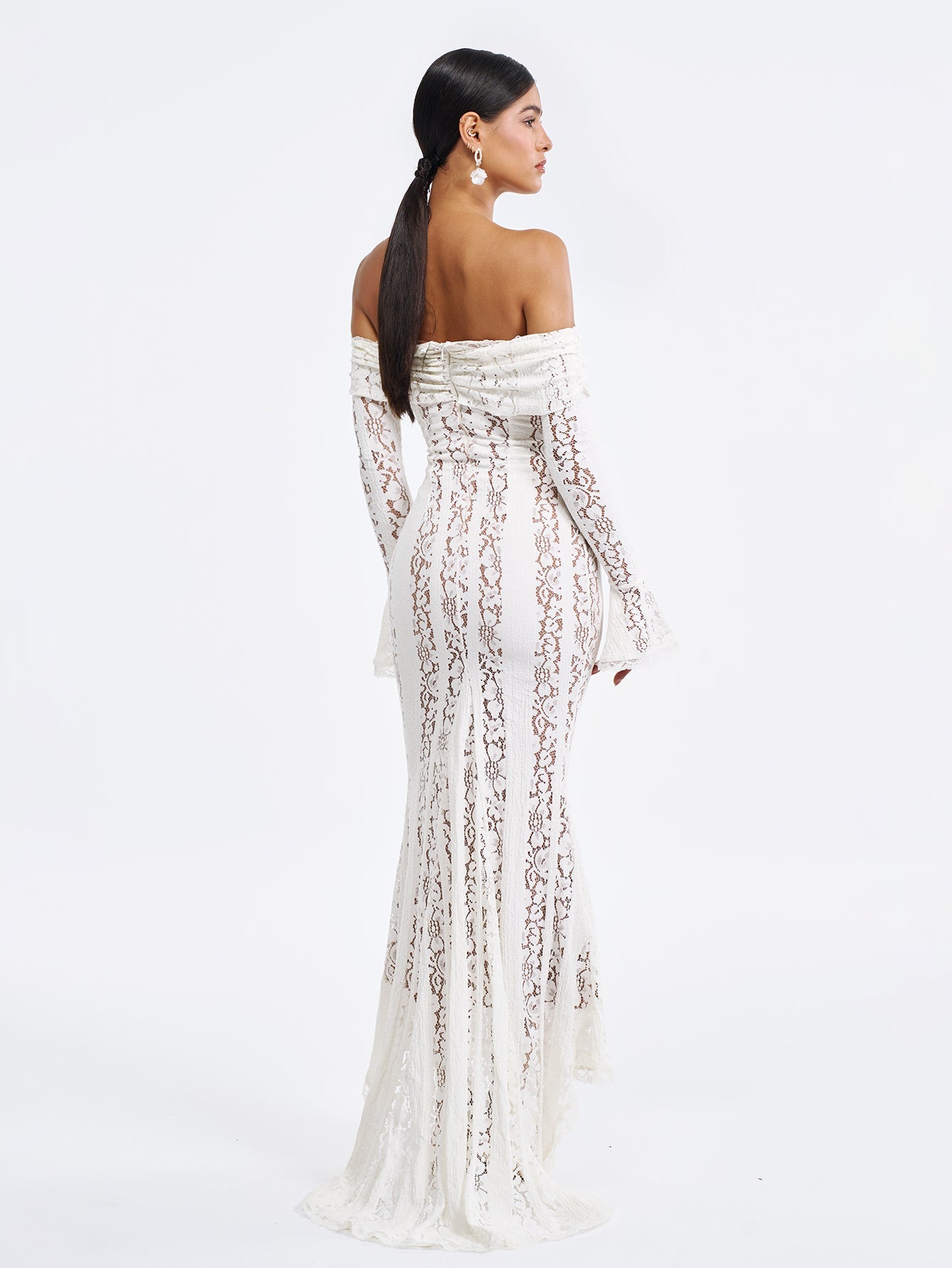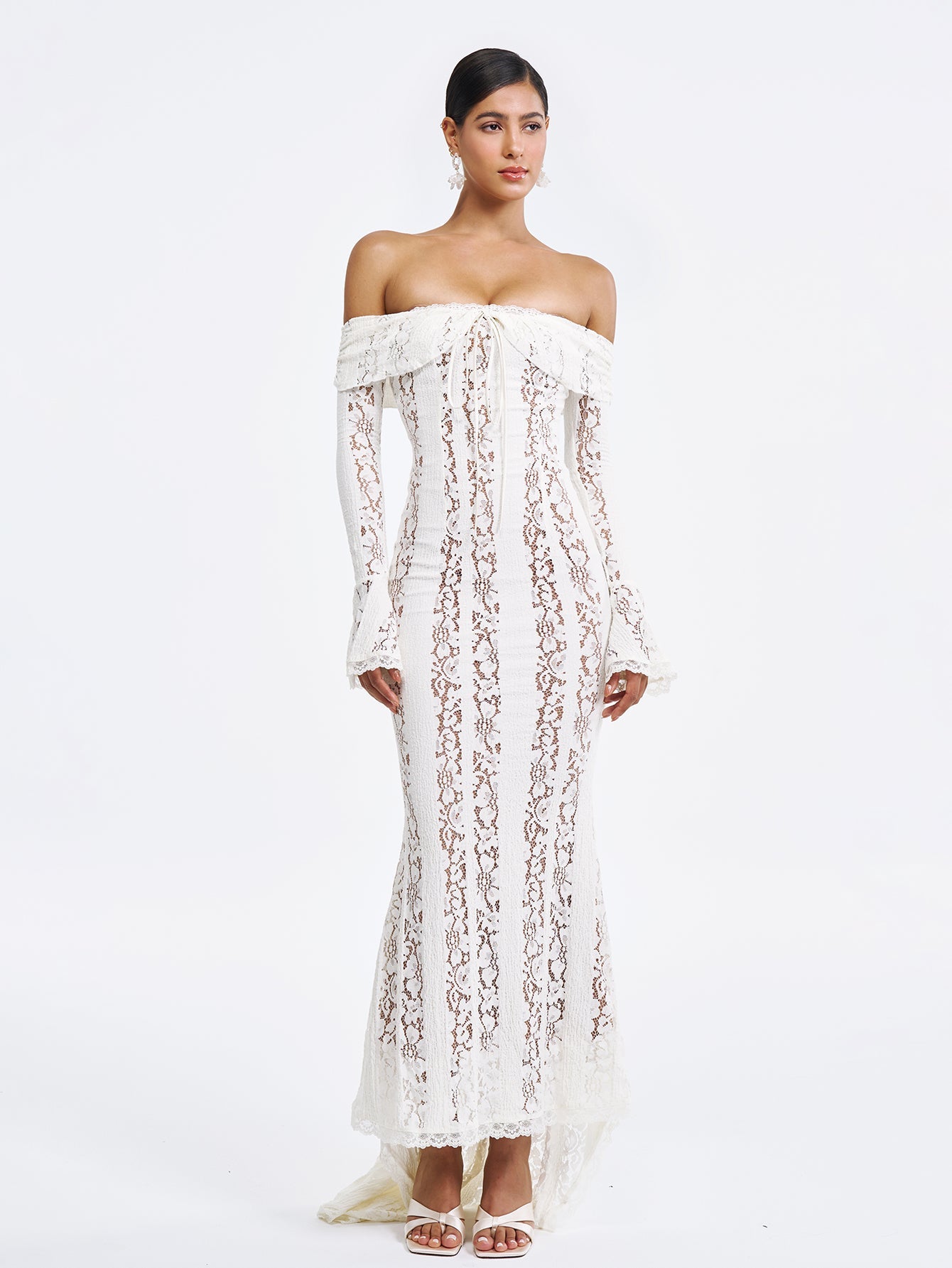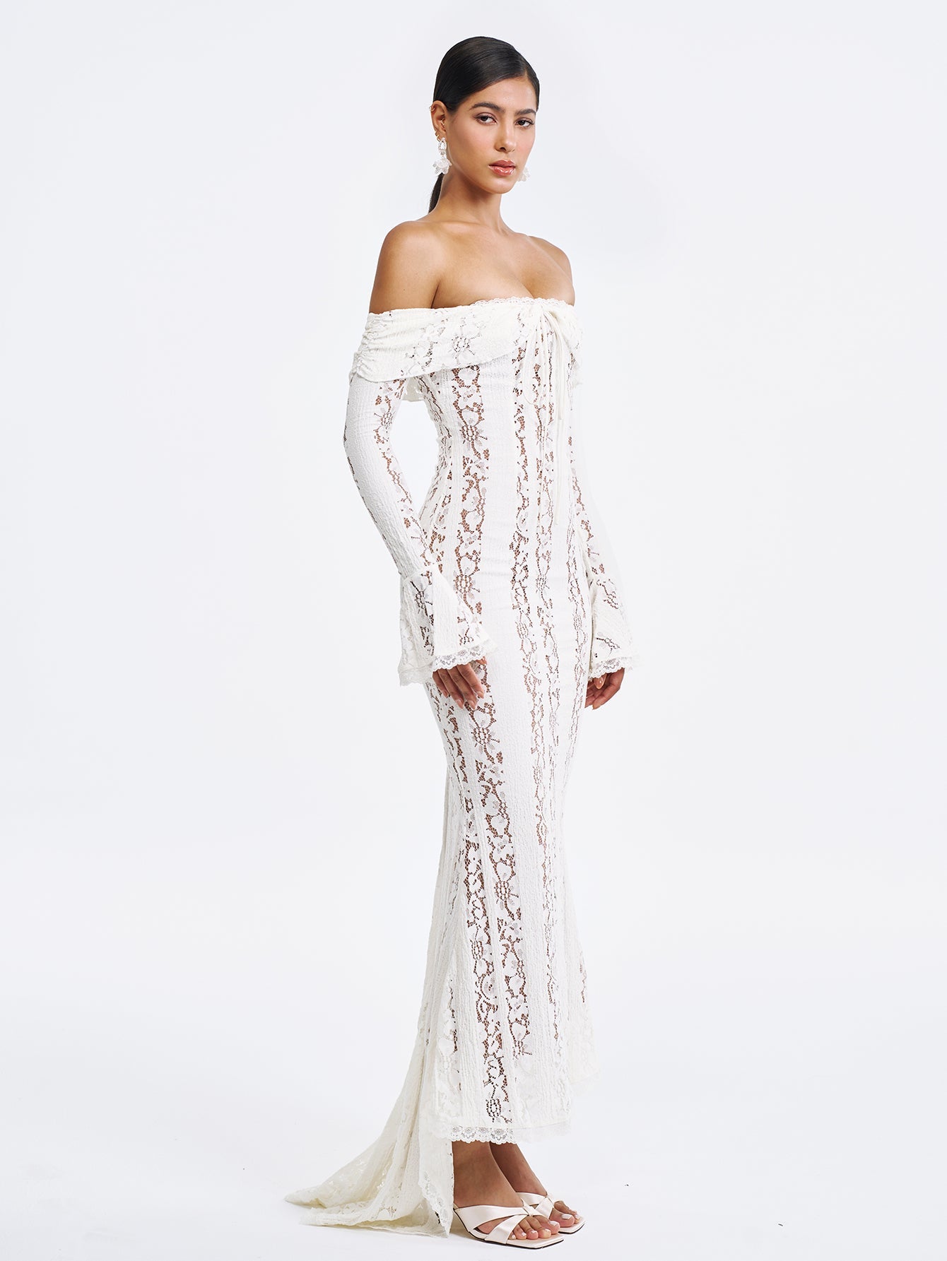 Çiçek Dantel Uzun Kollu Omuzdan Bağlamalı Maksi Elbise
