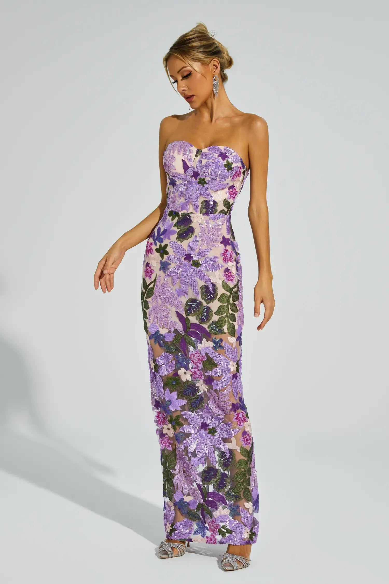 Leanna Yeşil Çiçek İşlemeli Uzun Elbise