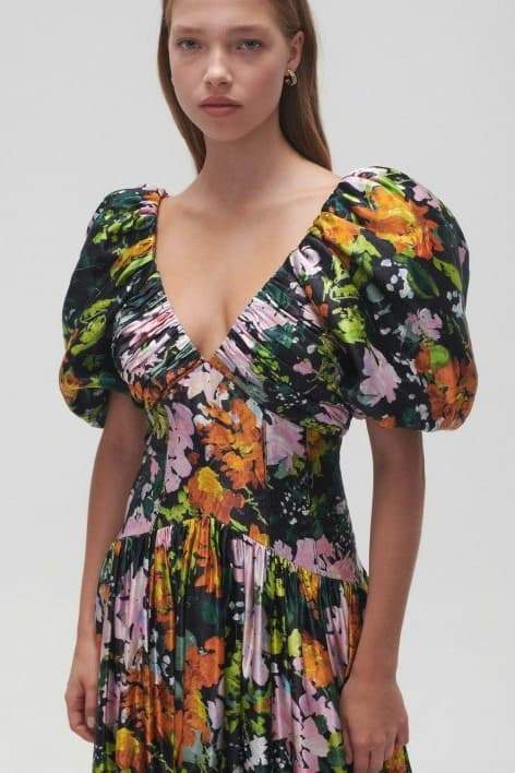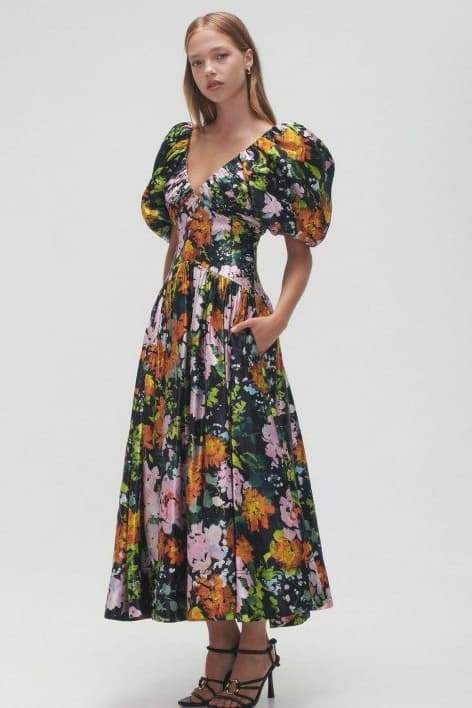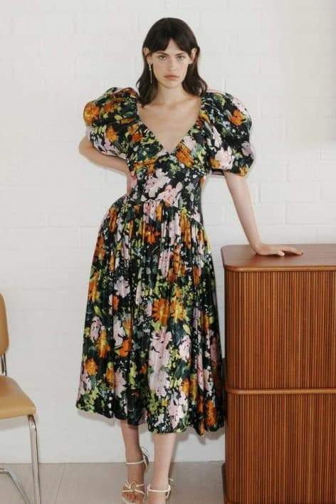 Megan Baskılı V Yaka Puf Kollu Midi Elbise