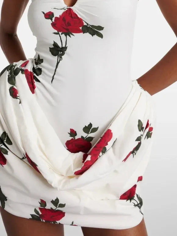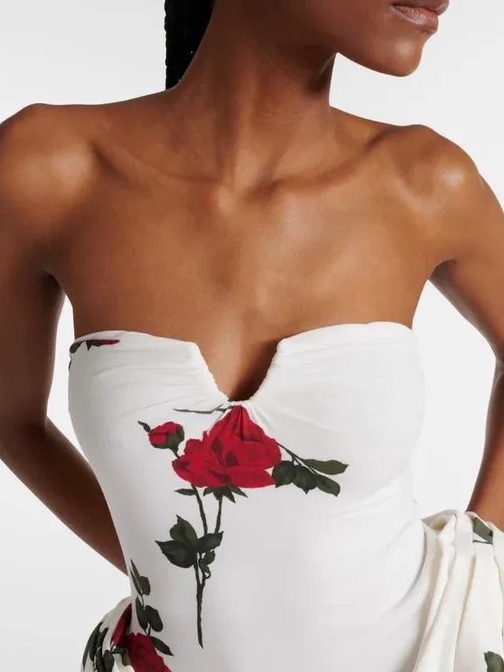 Gül Çiçek İşlemeli Straplez Mini Elbise