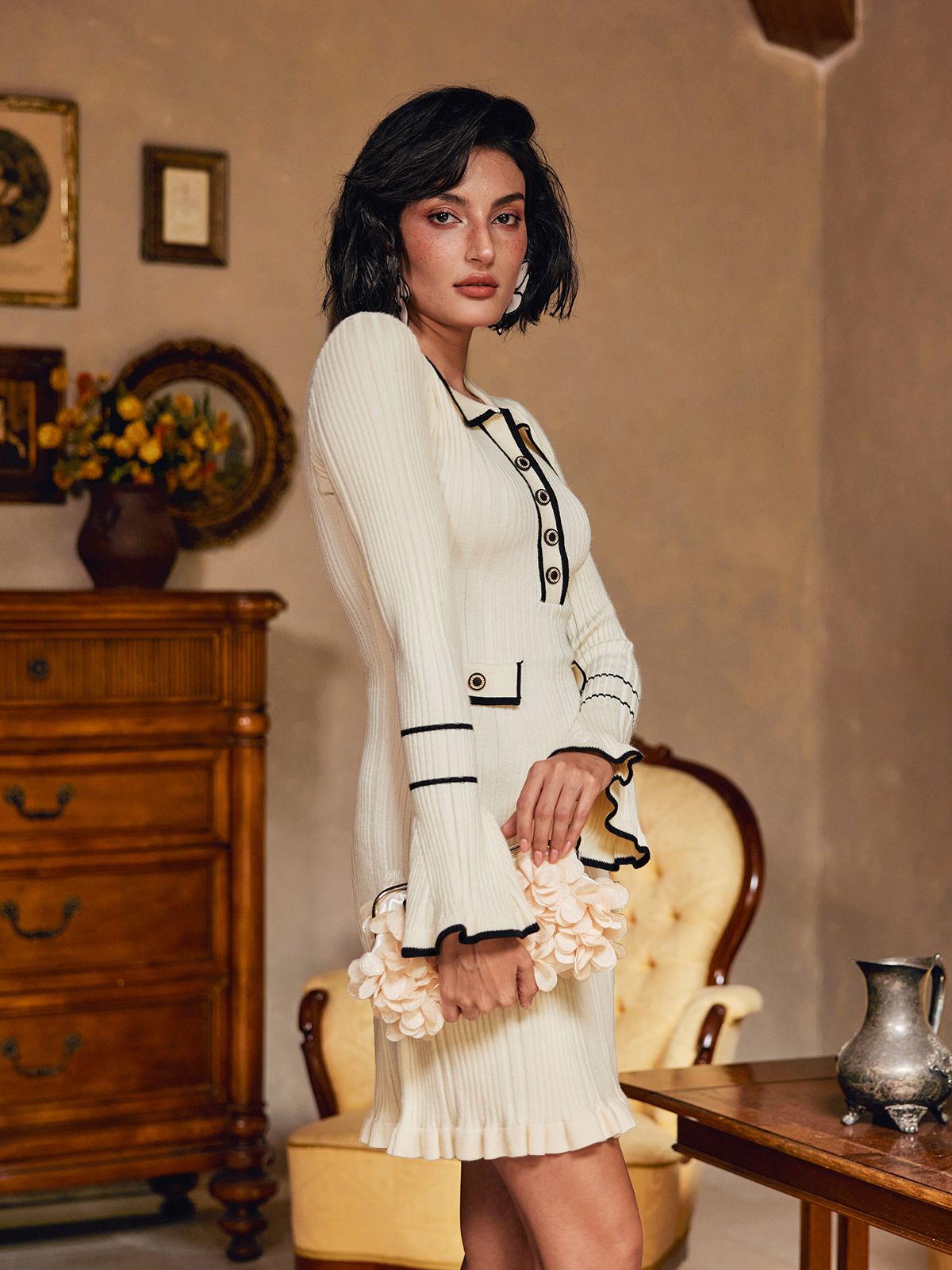 Shalita Uzun Kollu Volanlı Düğmeli Örme Mini Elbise