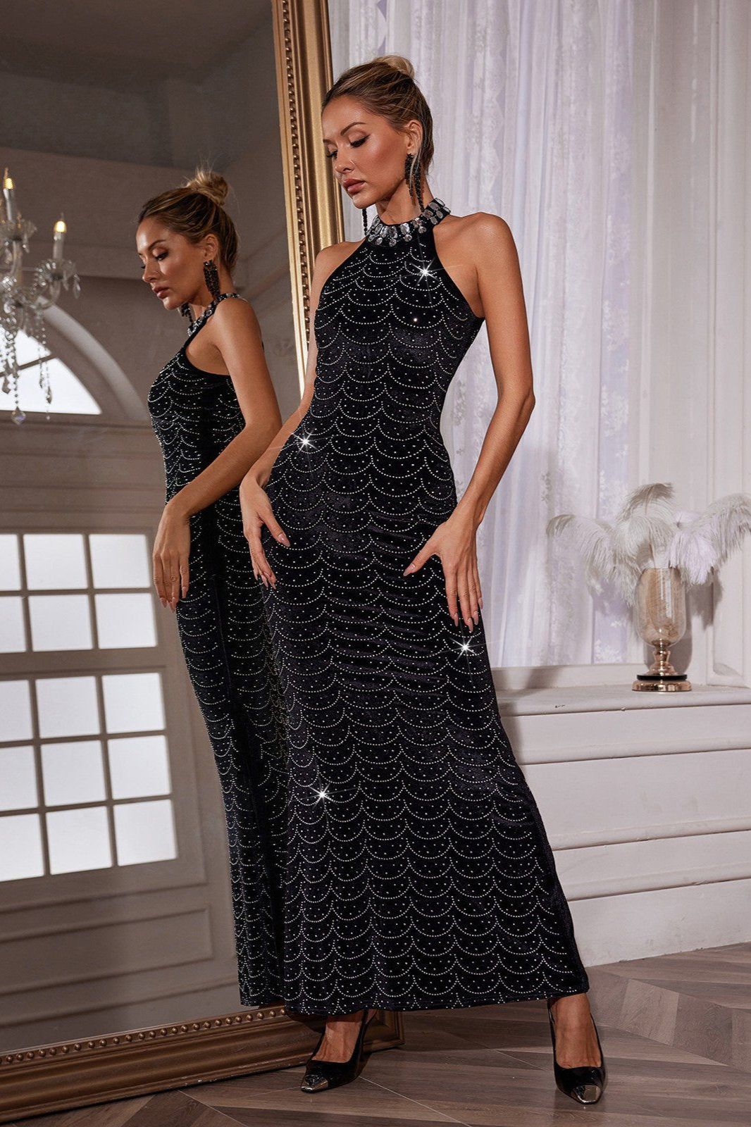 Sunita Boyundan Bağlamalı Kristal Kadife Uzun Elbise