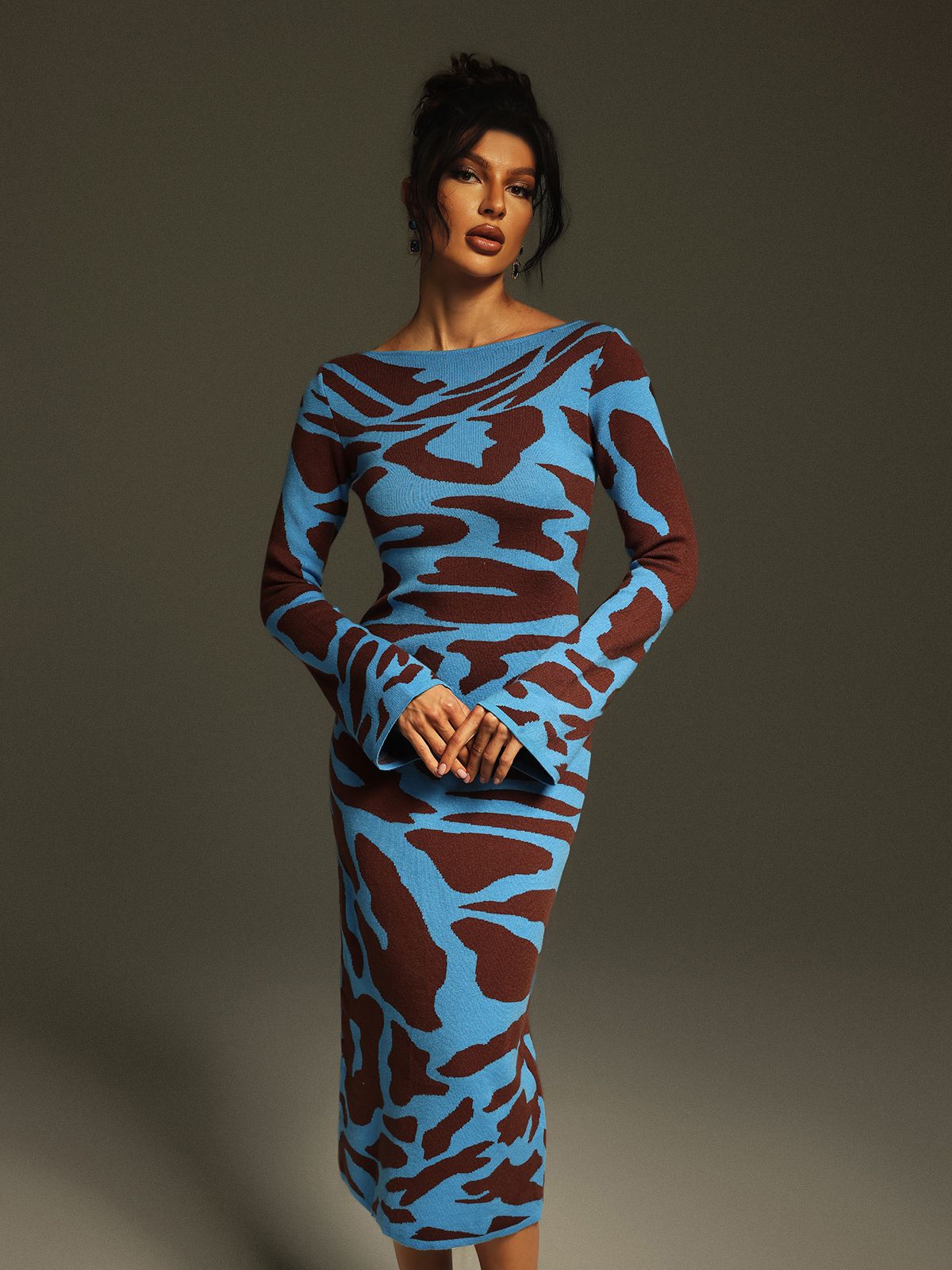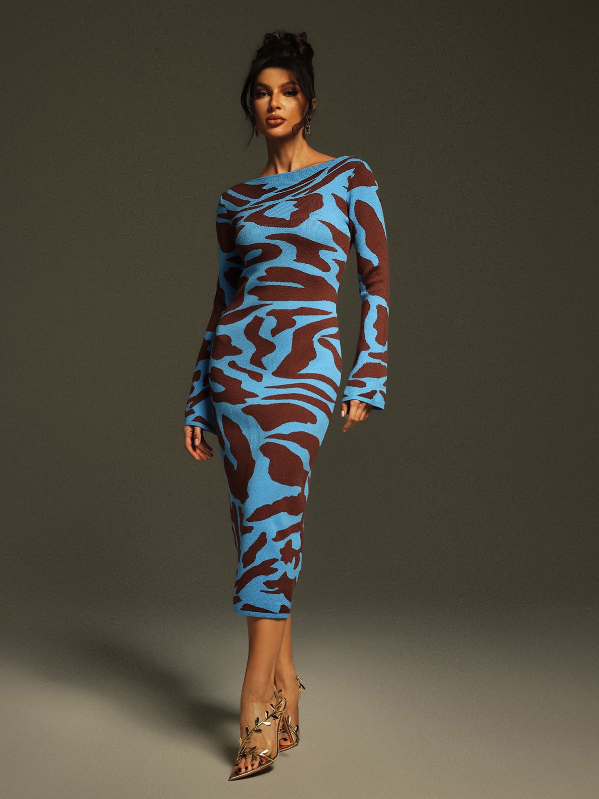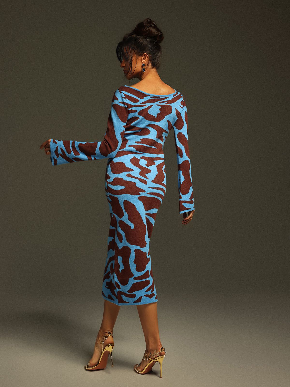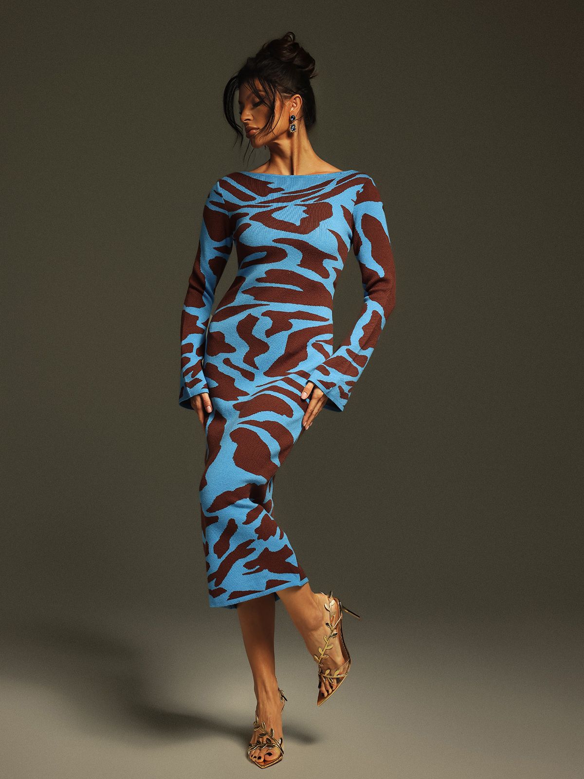 Taysia Uzun Kollu Leopar Örme Midi Elbise