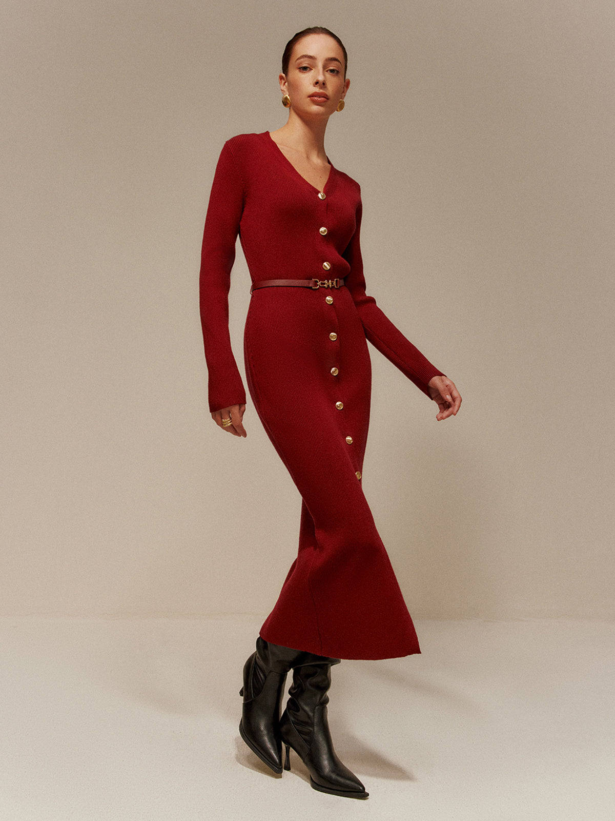 Tyra V Yaka Düğmeli Kemer Örgü Elbise Uzun